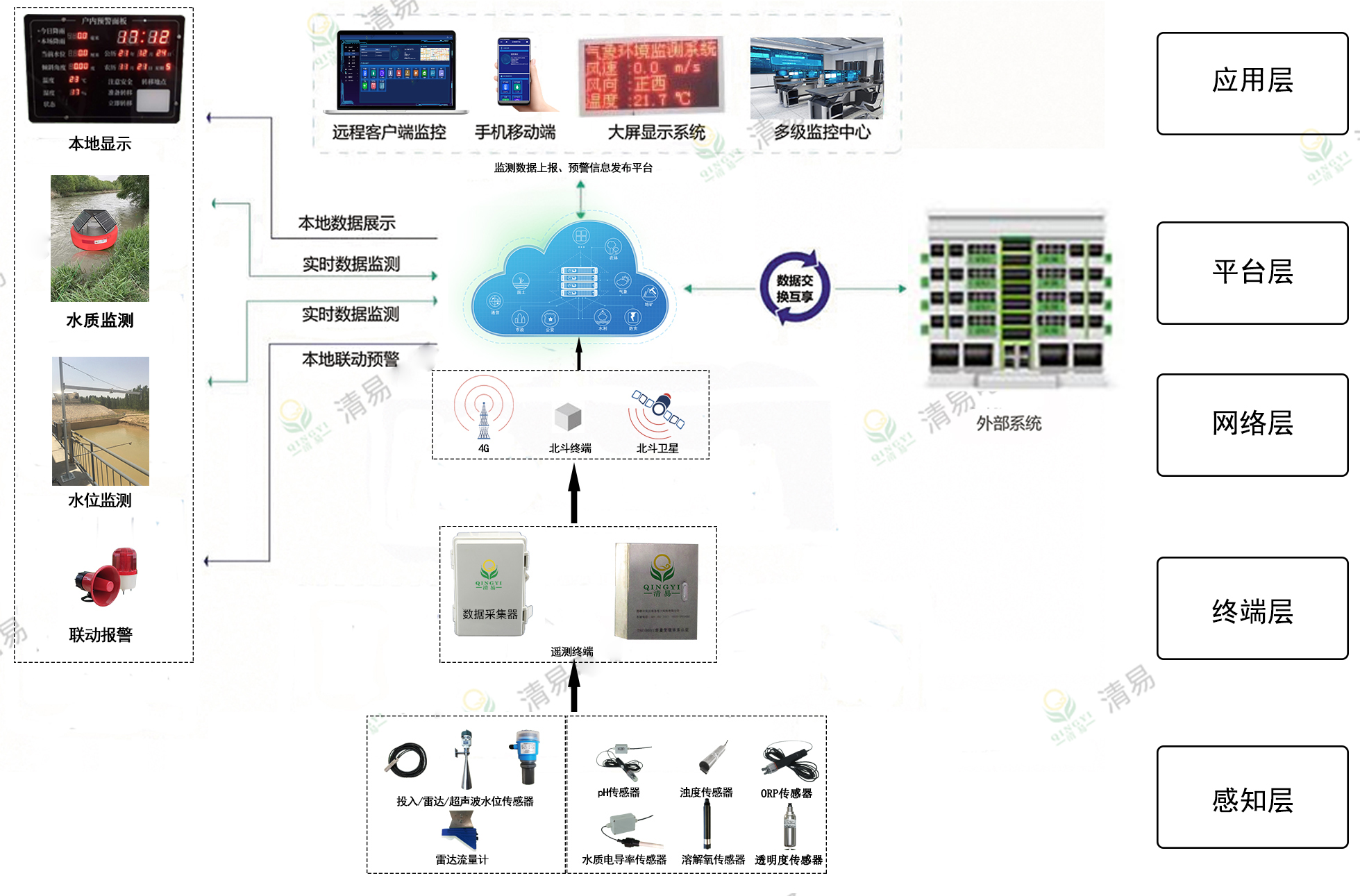 水质监测终端(包含pH、溶解氧、浊度、电导率、氨氮、温度和ORP等水质传感器)、数据采集仪、水文传感器(水位、流速)、现场控制柜、供电系统(市电/太阳能),承担着实时采集水体各项理化指标的任务,是该方案的“感知触角”。